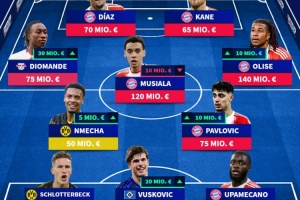 体育资讯3月21日讯 德国转会市场列出了德甲球员身价最高阵容,奥利塞、凯恩、穆西亚拉、迪亚斯在列。