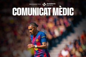 拉菲尼亚已返回巴塞罗那,开始接受相关治疗。预计康复期为五周。