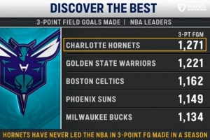 黄蜂主场迎战步行者,转播方给出本赛季球队三分命中总数Top5: