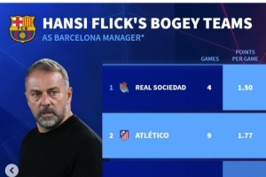 弗里克执教巴萨以来对阵马竞场均拿到1.77分,仅多于对阵皇社
