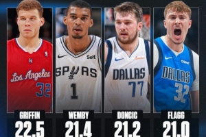 本赛季弗拉格场均21分,10-11赛季的格里芬场均22.5分,是00年至今场均得分最高的新秀,文班亚马排在第二,东契奇排在第三。